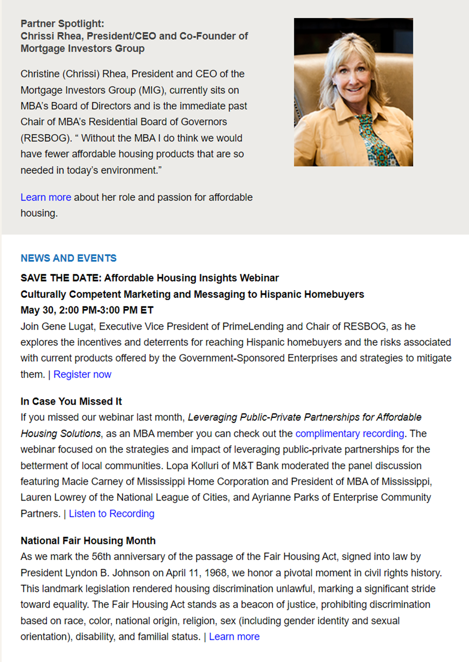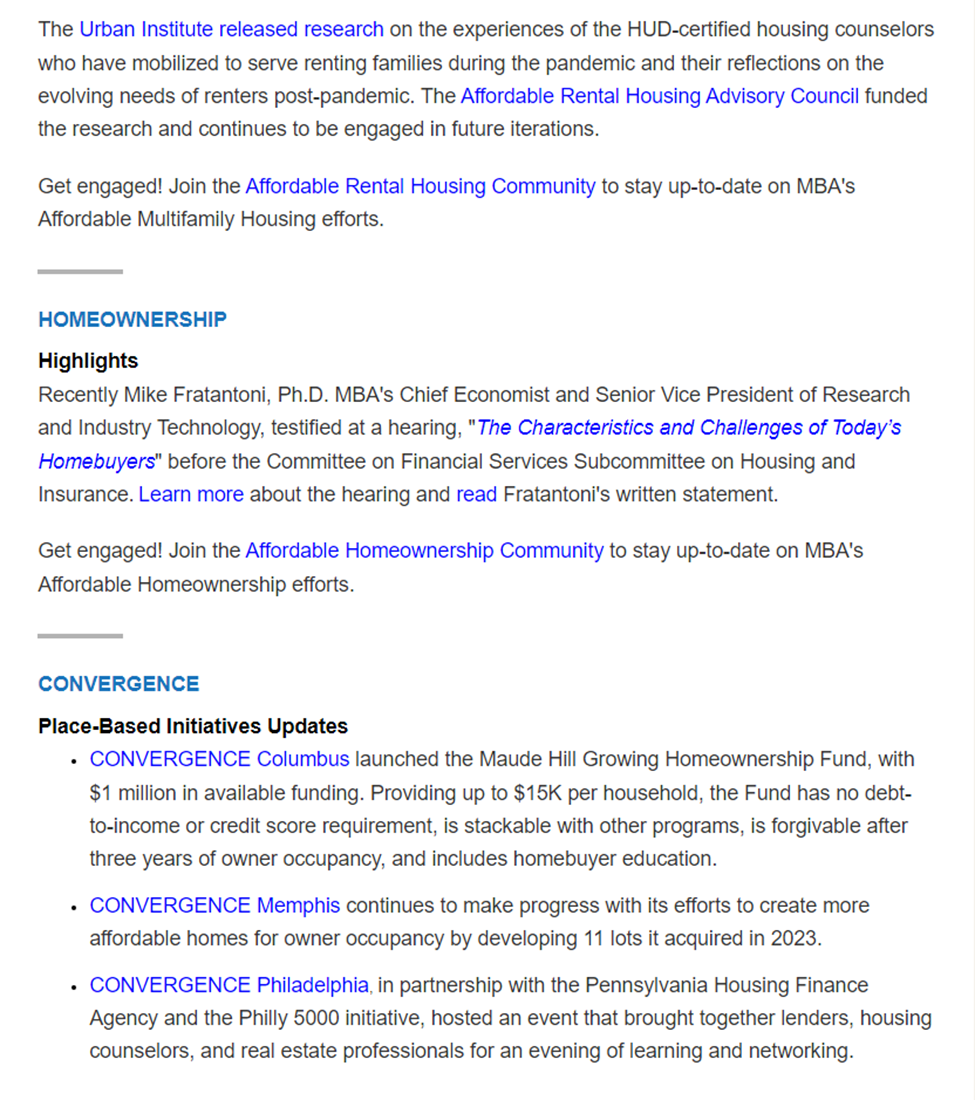 Last week, MBA published the second iteration of the Affordable Housing Insights quarterly newsletter.